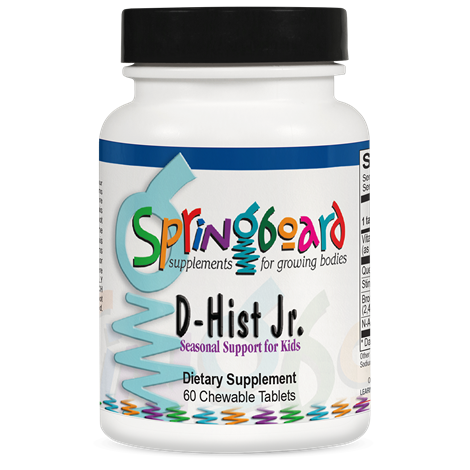 D-Hist Jr.™ is a great-tasting, chewable tablet that includes a targeted blend of flavonoids, antioxidants, proteolytic enzymes and botanicals designed to provide comprehensive support for children with seasonal challenges caused by common environmental allergens. D-Hist Jr.™ includes quercetin, a powerful flavonoid to support healthy histamine levels. It supplies bromelain to enhance the absorption of quercetin and to support mucosal tissue health and stinging nettles leaf to balance hyper-immune response. N-acetyl cysteine clears the airways by promoting normal viscosity of mucus. This unique nutritional combination safely promotes healthy nasal and sinus passages for children with elevated histamine and respiratory irritation.
